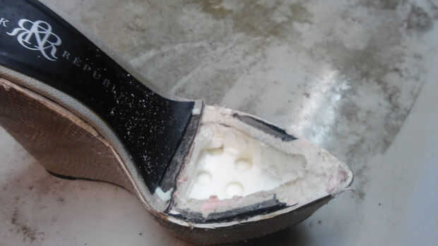 Cuando pelado en todas las capas de los dedos del pie los zapatos encontré la plataforma del zapato fue hecho de un plástico duro.