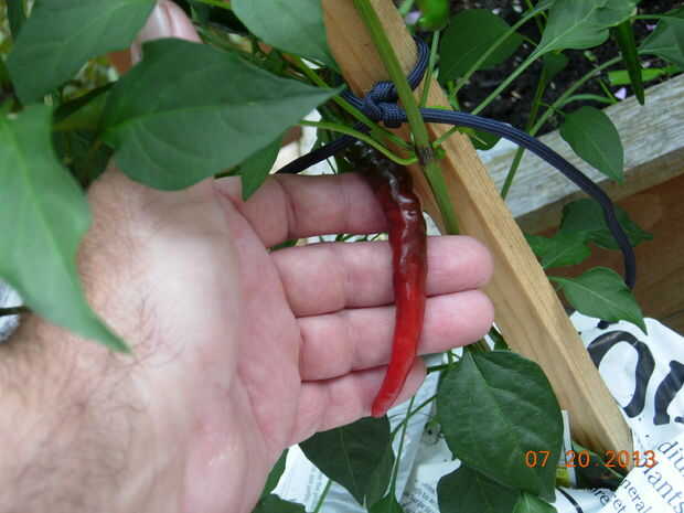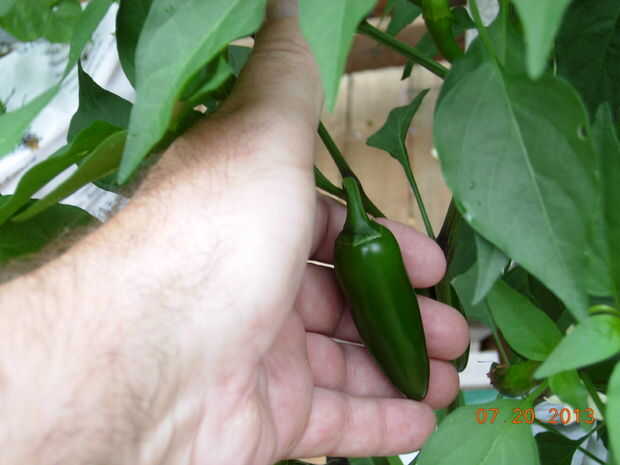 - Como con todas las plantas de pimienta, las dos plantas en este cubo se van fuertes. El Jalepano tiene una buena cantidad de fruta que está ganando tamaño día a día. La cayena también es agradable y sano y mostrando su primer pimiento rojo que da vuelta. Que se parece un poco espantoso.