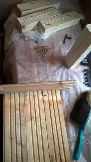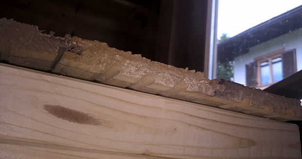 Tus 4 posts no fijarse justo en el borde de su frente y paredes, de nuevo porque usted quiere las paredes laterales para conectar muy bien detrás de sus paredes anterior y posterior. Tan medir lo delgado es su panel de madera, en mi caso 1cm y trazar una línea a distancia de los lados de su frente y detrás de las paredes. O como yo hice y coloque un panel al ras contra la pared como plantilla (según la primera imagen aquí), y marca con lápiz hasta dónde en viene del lado. Se trata de que tu post debe colocarse.