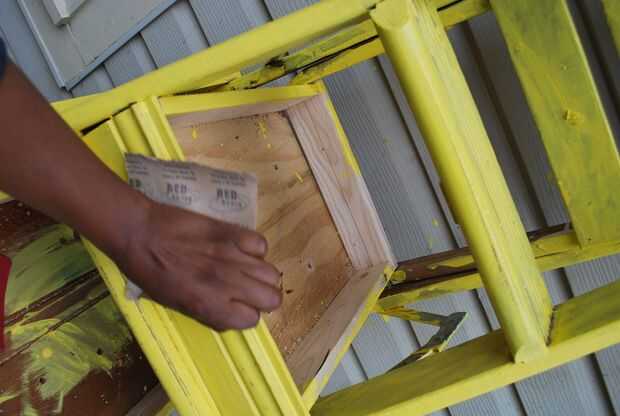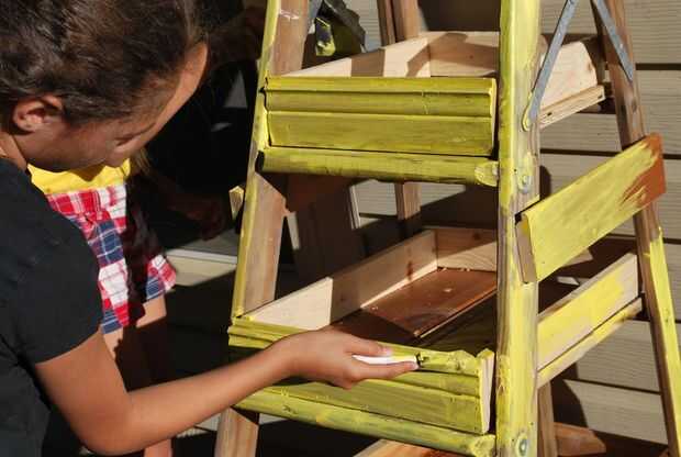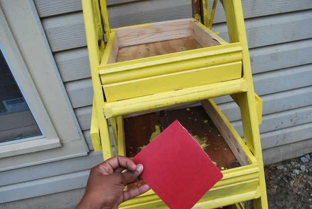 Pintar completamente la escalera. Una vez que la pintura se seca lijar la escalera con un grueso papel de lija para darle a la jardinera un aspecto vintage.