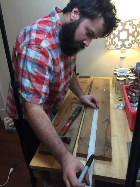 Dependiendo de cuántos tarros de masón que desea agregar por Junta, medida adecuadamente para el espacio. Cada una de mis tablas eran aproximadamente 40 pulgadas así que separé mis frascos 8 pulgadas aparte y centrada en ellos usando una regla y un rotulador.