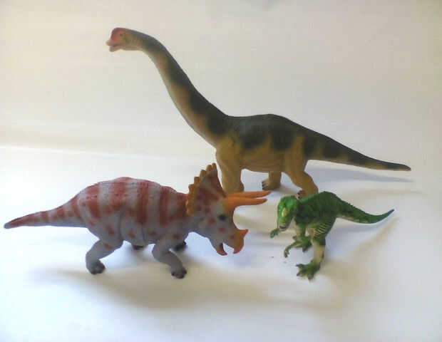 La primera cosa que necesitas es los dinosaurios del juguete! Los mejores a utilizar son los grandes, en lugar de los pequeños T-Rex a la derecha - era demasiado pequeño y no terminan lo usando. Para tener una idea de escala, la brachiasaurus en la parte posterior es aproximadamente 16 pulgadas de largo. El triceratops es aproximadamente 12 pulgadas de largo. Este es el tipo de dinosaurio que buscas! No trato de hacer todo más pequeño que cerca de 8 pulgadas de largo. Si no tiene alguna que sus hijos han superado (o conoce a alguien que lo hace), trate de caridad tiendas/tienda. Es particularmente digno de preguntar si tienen los nombres marcados en ellos. La gente no tiende a comprarlos porque no quieren que sus hijos jueguen con juguetes que son obviamente de segunda mano.