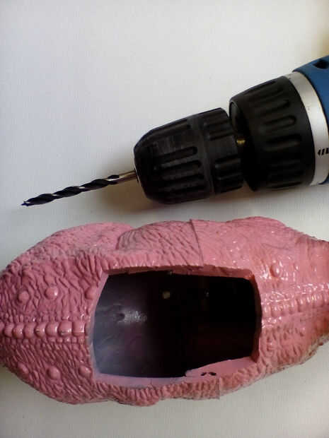 Ahora, necesita perforar algunos agujeros de drenaje - no hacerlo antes de la pintura a pistola como puede obstruir los agujeros otra vez. Es difícil ver en la foto, pero están ahí! Taladro de agujeros por lo menos media docenas, pero trata de no ponerlos muy juntos, ya que esto pueden hacer que el plástico del dinosaurio para romper o rasgar.