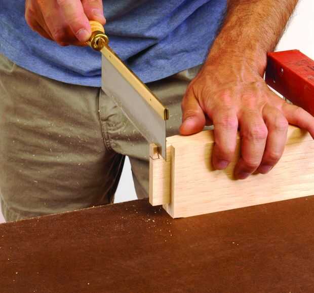 Se puede utilizar ya sea backsaw o sierra de cola de Milano para hacer los cortes. La cadera o el hombro sobre la espiga es necesario llenar la ranura del panel de la marco en los extremos de los largueros. También añade fuerza a la articulación. Le sugerimos cortar los hombros de la espiga haunched con un backsaw. Los otros hombros se cortan con un disco de moldurar.