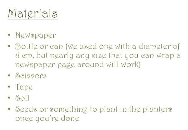 esto es una gran manera de hacer sus propio ollas siembra orgánicas. El producto final (es decir las macetas) son excelentes para las plantas pequeñas, se puede poner muy juntas y cuando la planta está lista para poner en el suelo se puede plantar co