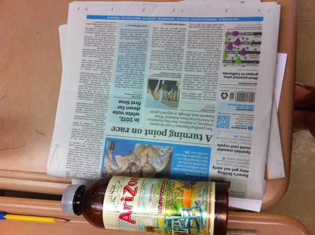 El primer paso de este proyecto es recoger periódicos y botellas que desea utilizar para el proyecto. Realmente no es necesario que muchos, sin embargo, si sólo estás plantando flores unos ya que cada periódico tiene 16 páginas. De hecho, sólo utilizamos uno o dos periódicos de la escuela que hemos encontrado en nuestro salón de clases y fueron capaces de hacer diez macetas. Además, como hemos mencionado en nuestra página de materiales, asegúrese de obtener botellas o latas puede envolver la página de un periódico alrededor. Utilizamos una botella de Arizona que fue de 591 mL, pero como eres capaz de roll y la página de un periódico alrededor de la botella, que funciona.