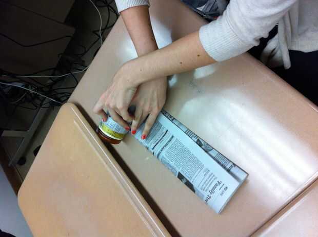 Ahora, usted tiene que comenzar a rodar los periódicos alrededor de la botella. Asegúrese de que haga esto lo suficientemente apretada para que no caiga aparte una vez que se llene. Este paso es crucial para el producto final de este proyecto. El diario al final de la cinta, y asegúrese de que esté lo suficientemente seguro para mantener en el suelo.