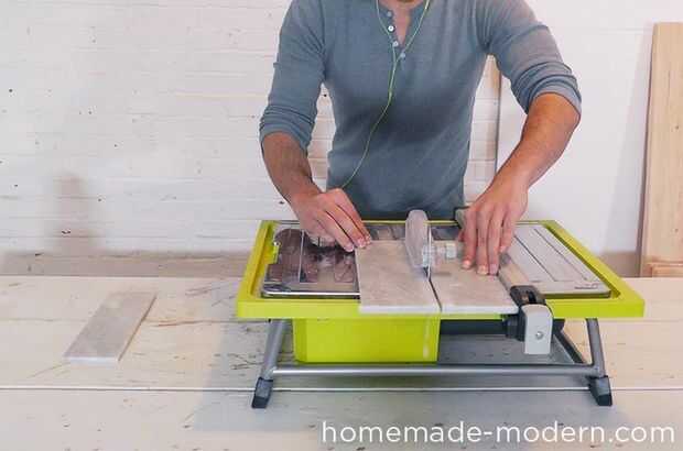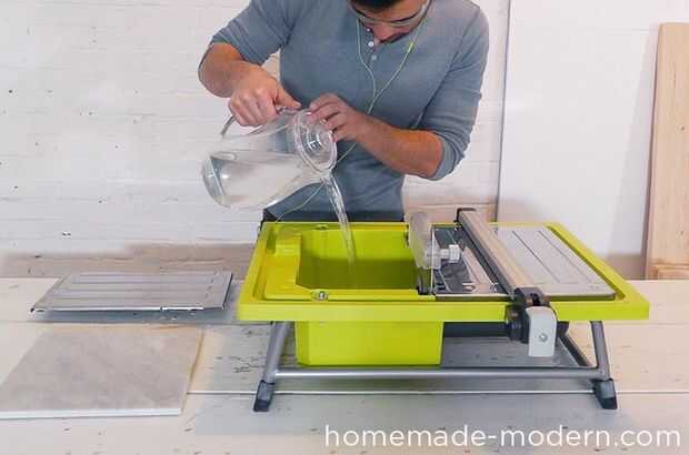 I establecer la sierra y lleno el depósito de agua. El agua impide que la hoja se consigue demasiado caliente y también mantiene el polvo bajo control. Que establece la guía de corte a aproximadamente 3,75" y cortar tiras de la baldosa. Fue realmente fácil, pero usted no puede ir demasiado rápido. Acabo de probar lentamente para alimentar a la piedra a través de la sierra y dejar que la hoja haga el trabajo. Para los azulejos de 24 pulgadas más largo, sería bueno tener un juego extra de manos para atrapar las piezas largas como que son empujados a través. Corto 5 piezas para armar una caja larga.