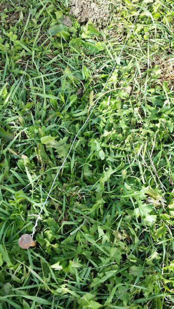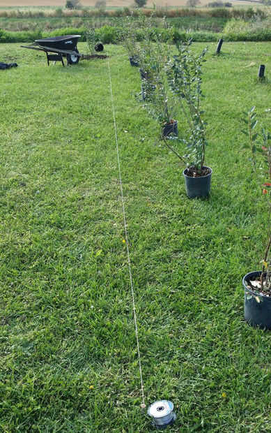 Después de decidir el punto de partida, encadenan una línea de alambre para que el seto se puede mantener recto cuando se siembra. Es realmente fácil llegar la línea torcida sin este paso. Este es un paso simple y resulta para ser muy efectiva. Tenga en cuenta que la línea se enrolla alrededor de las estacas de 4" por encima del suelo. He encontrado en unas experiencias pasadas que sostiene al ras en la tierra realmente puede crear una línea torcida como puede conseguir trasladar y celebrada fuera de posición por hierba o tierra.