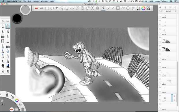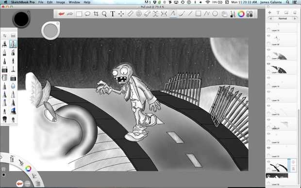 En cuanto al cielo yo qué sketchbook pro llama un "cepillo redondo suave sintético" pero se puede utilizar lo que desea. Para hacer la luna usé la herramienta Elipse para que quede redondo y con la herramienta de sombra en blanco para que se vea real. Las estrellas sólo, haga clic en el capa de cielo y utilizar la herramienta Borrador en el más pequeño ajuste lugar puntos y en todas partes.