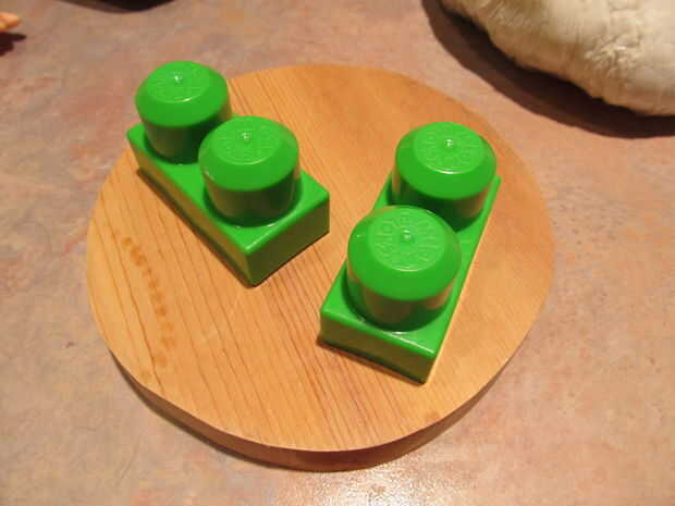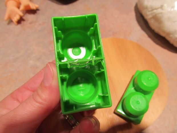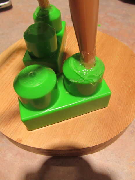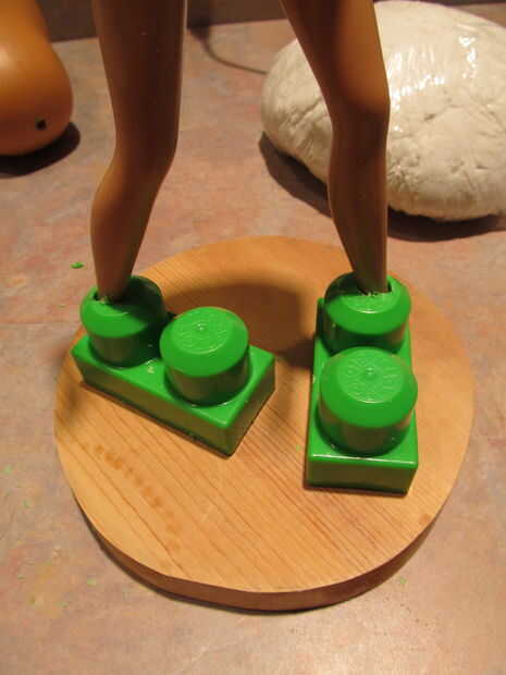 * Perfore un agujero a través de la parte superior de una de las clavijas en cada bloque. Taladre los agujeros sólo lo suficientemente amplio como para barbie para exprimir su pie grasa en, pero no muchísima holgura alrededor de los tobillos.
