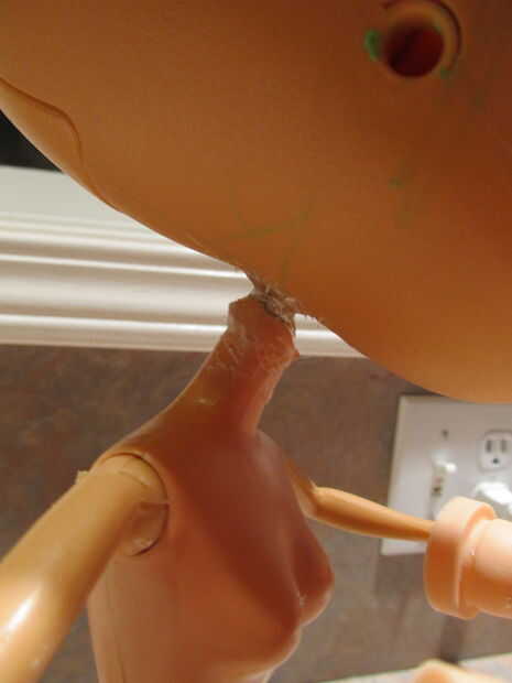 * Ahora quitar cabeza de barbies (si aún conectado) y observar el interior del cuello. Algunos ya están huecos y algunos pueden tener alguna conexión de plástico. Ahuecar el cuello con su taladro.