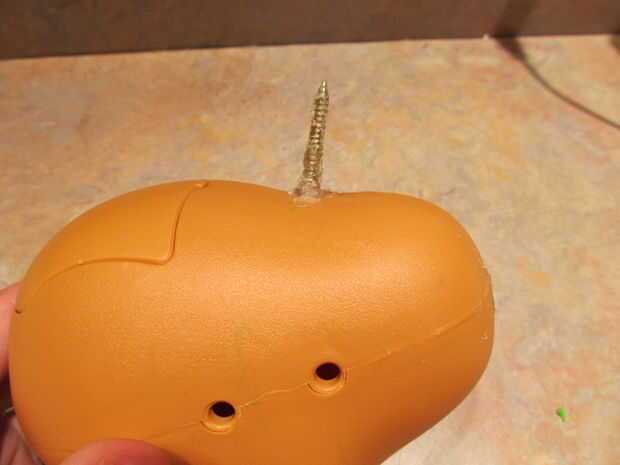 * Conecte la cabeza al cuerpo. Apuntar el extremo ranurado más gordo de la patata hacia arriba, luego deslice el tornillo de abajo del cuello hasta que encajen juntos.
