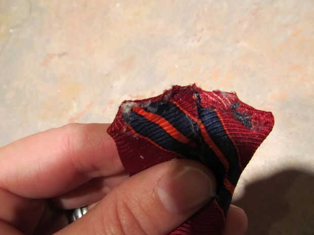 * Ahora colocar un punto de pegamento de 1" hacia abajo desde el extremo cortado y doblar sobre el pegamento. (esto crea un frunce)