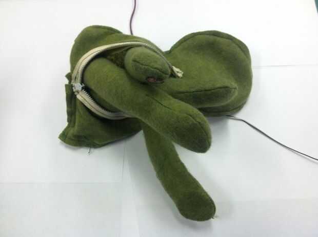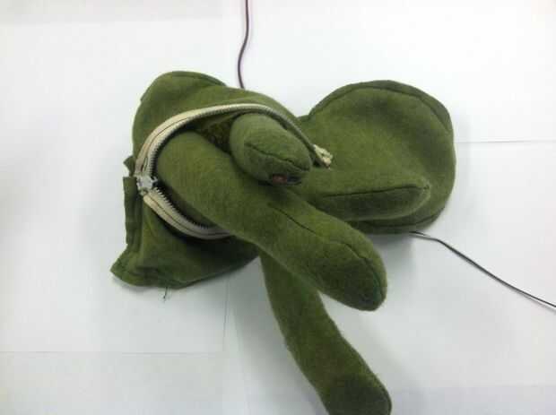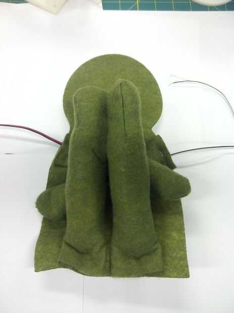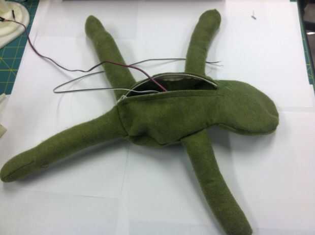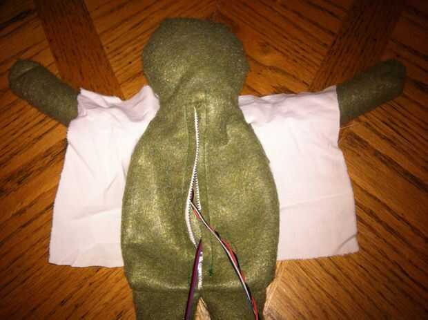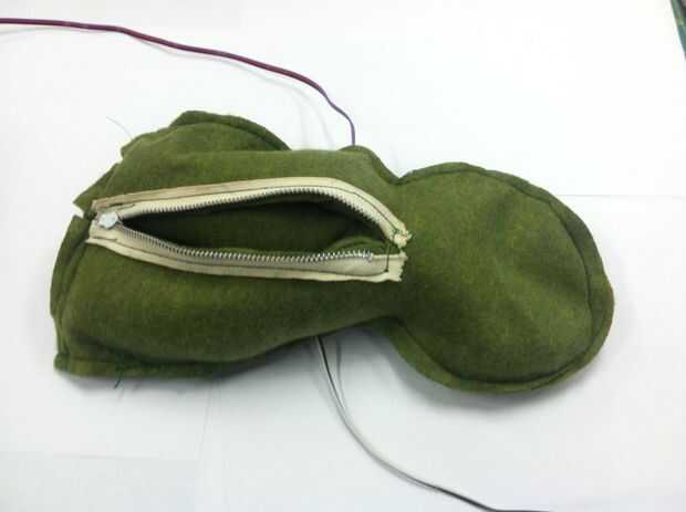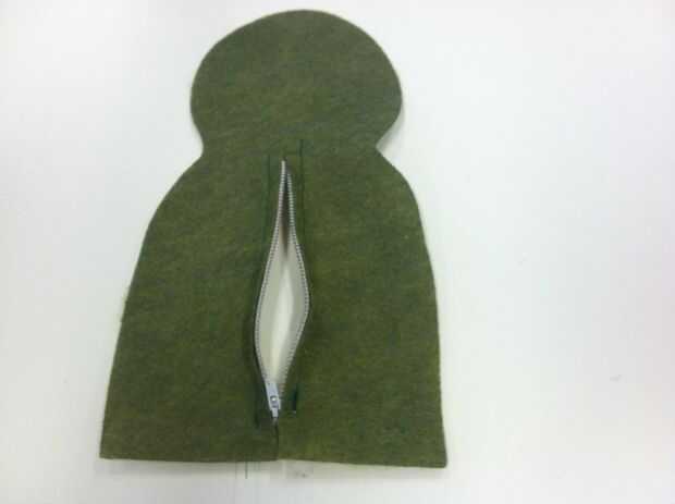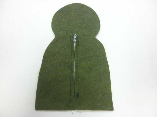 Luego, doblar las formas de brazo y pierna por la mitad y coser el resto. interior al reves y cosas con polyfil u otro relleno. A continuación, tomar una de las formas del cuerpo y coser una cremallera en él y cortar el fieltro encima de la cremallera para permitir que se mueva. Con el cierre levemente abierto, el cuerpo cortado con la parte exterior de la cremallera hacia arriba y prender los brazos y piernas para el fieltro para que apunten en la dirección opuesta a la que desea (las piernas hacia arriba y los brazos en) y colocar la otra pieza de cuerpo sentía en la parte superior y pin en su lugar. Ahora usted puede coser alrededor del borde, asegurándose de que usted cose en los brazos y las piernas. Cuando han pasado alrededor de todo el cuerpo, luego abrir la cremallera y gire derecha hacia fuera.