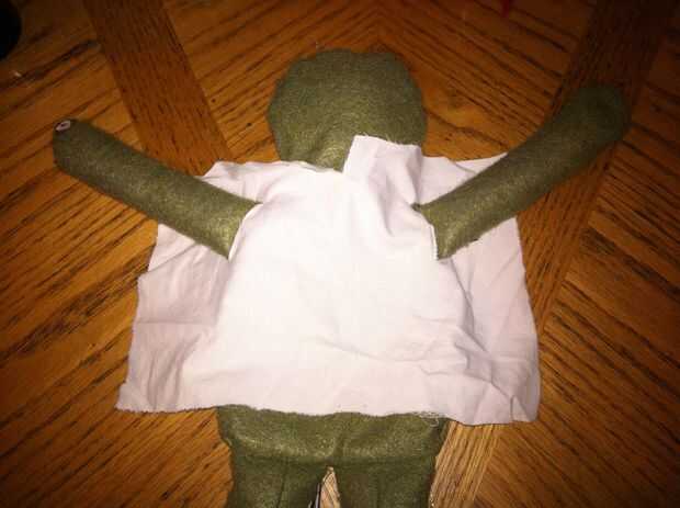 La camisa es un simple pedazo de tela blanca con agujeros de corte para los brazos y caliente pegado en la espalda. El collar se hace cortando una pequeña ranura y doblar la parte superior encima.