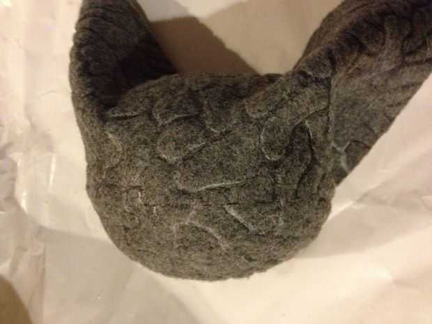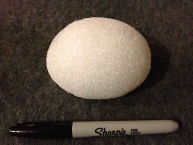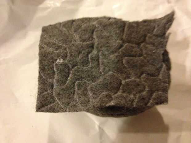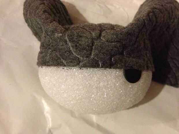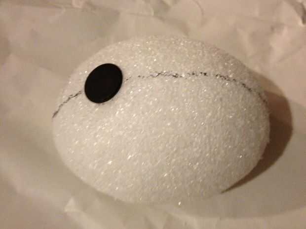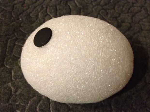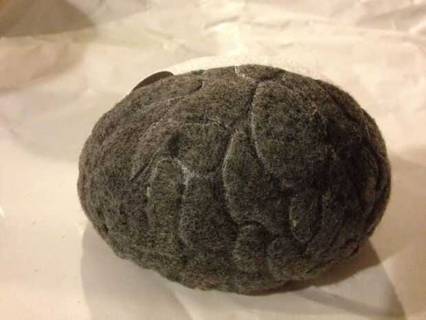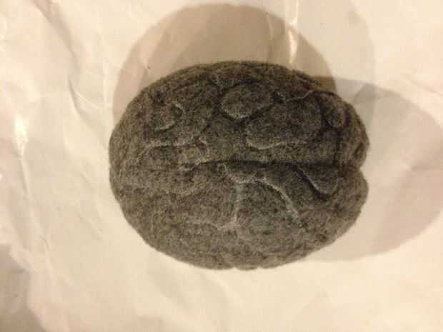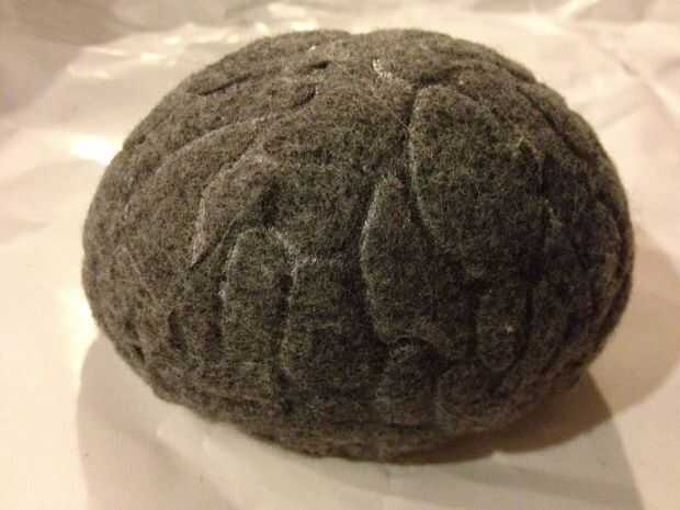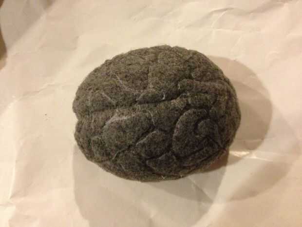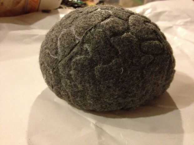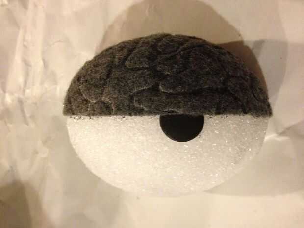 Para hacer que el cerebro, comenzamos con un huevo de espuma de poliestireno y formado por aplanar la base y la creación de una costura en el centro para separar el hemisferio izquierdo y derecho. Había pegado el botón RFID para la espuma de poliestireno y luego cubre la espuma de poliestireno con textura de fieltro gris y une con pegamento caliente.