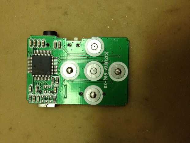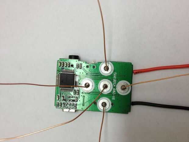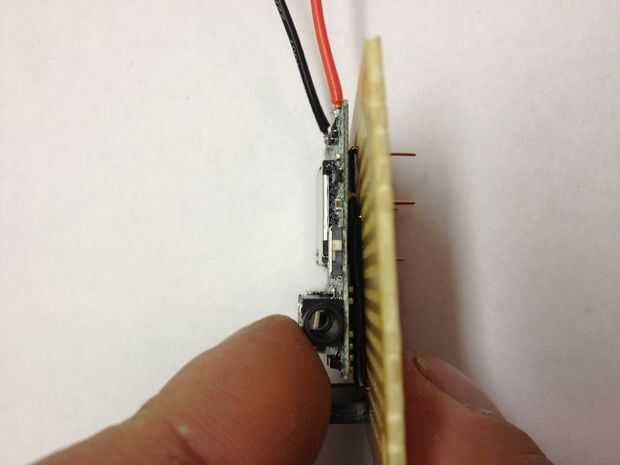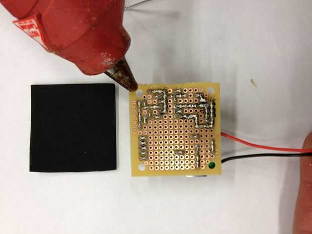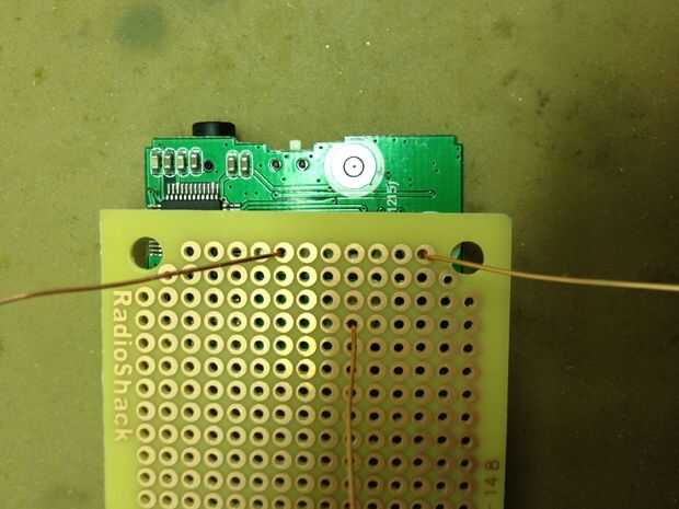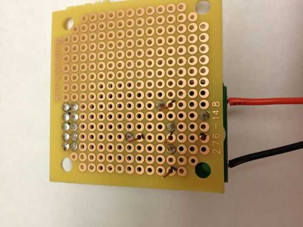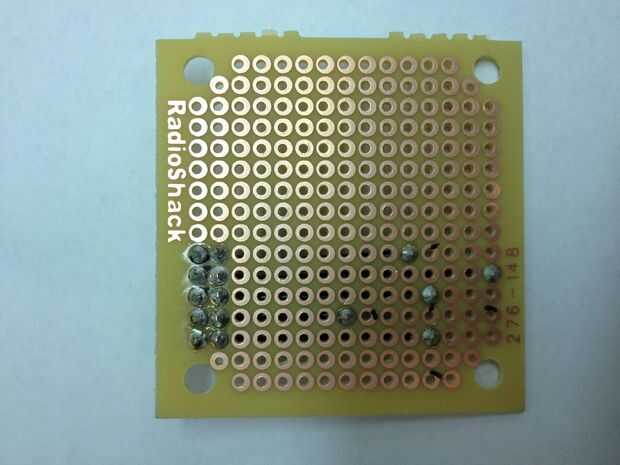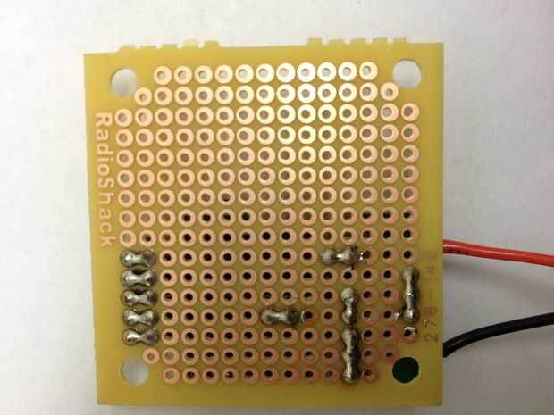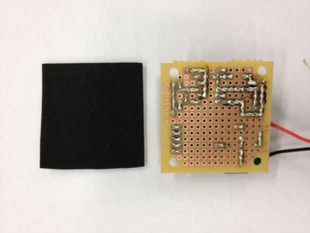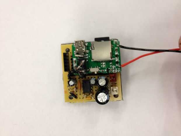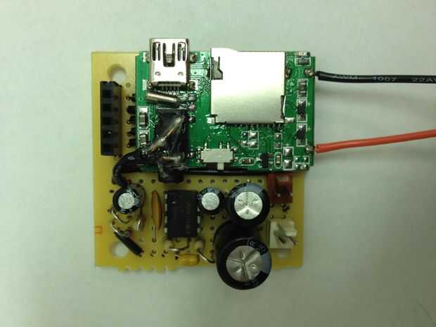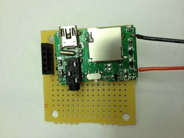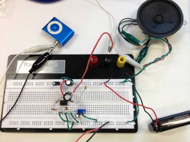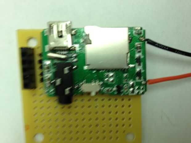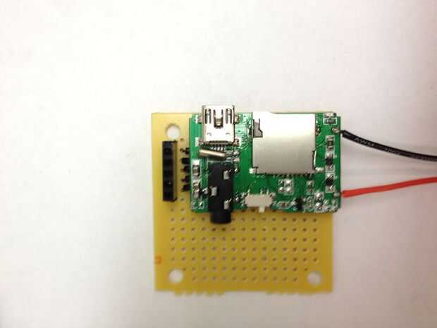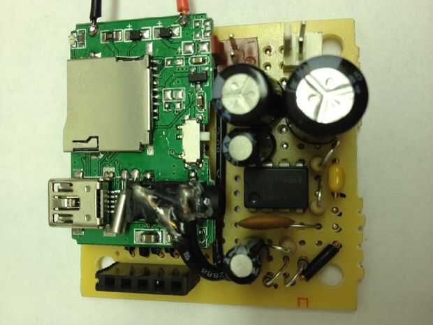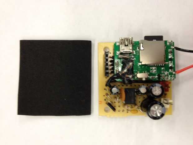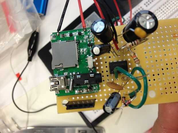 Para oír lo que se está reproduciendo en el reproductor de MP3, tenemos que amplificar la señal y ejecuta a un altavoz. Se utilizan un circuito amplificador simple utiliza un LM386 amplificador de audio (esta hoja de datos tiene un esquema bien), capacators y resistencias. Atamos el reproductor de MP3 directamente en el protoboard, por lo que no tenemos que correr los cables entre los dos.  También utiliza su propia pila de 9 voltios para el amplificador de potencia.