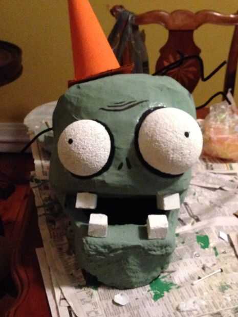 Mis hijos aman el juego "plantas vs zombies" video así que decidí hacer sus trajes.Para el Zombie: papel mached un globo de 12" y añade dimensión mediante el uso de periódico y cinta adhesiva. He pintado con pintura acrílica y cortar los ag