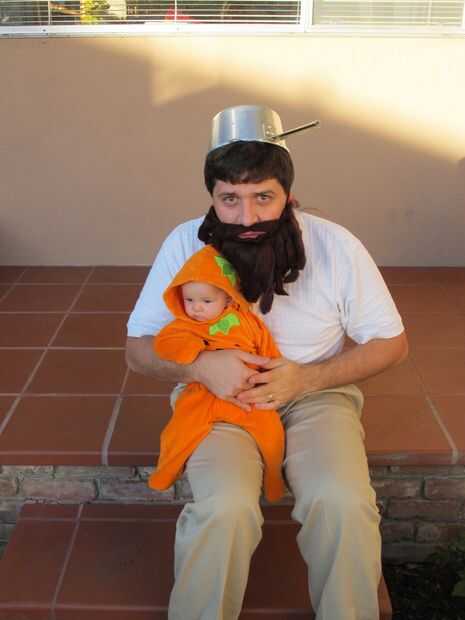 Vestir para arriba como Crazy_Dave es super fácil.  Blanco camisa de polo, $5 traje barba y una cacerola para la cabeza (algunas personas también pueden necesitar una almohada para relleno pero no lo hice).  La parte difícil sólo está manteniendo la bandeja en la cabeza.  Después de esta foto fue tomada, me di cuenta de que puede un clip de la carpeta en la bandeja de enfrente de la palanca del clip y luego pase el elástico de la barba a través del clip binder y la manija.