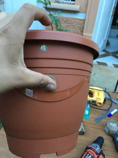 - Después hacemos un orificio en la maceta es donde pasara el sensor de humedad, el cual enterraremos en la maceta.