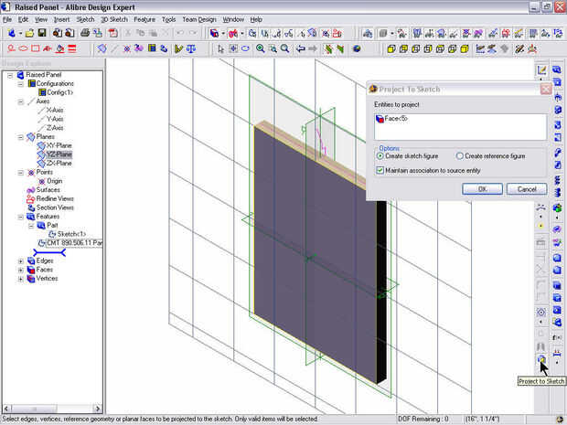Seleccione la cara frontal de la parte y seleccione proyecto de dibujo. El proyecto de esbozo de diálogo se abrirá con la cara frontal rellena automáticamente en las entidades al proyecto. Dejar el conjunto de opciones para crear croquis figura y comprobar Asociación mantener a la entidad de origen. Esto va a cambiar el bosquejo de la ruta para que coincida con la pieza, incluso si se realizan cambios en las dimensiones de la pieza original. Esto permitirá que otros paneles crear a partir de este panel cambiando sólo los parámetros para la parte ancho y longitud (o gruesa) y luego guardar como... bajo un nuevo nombre.