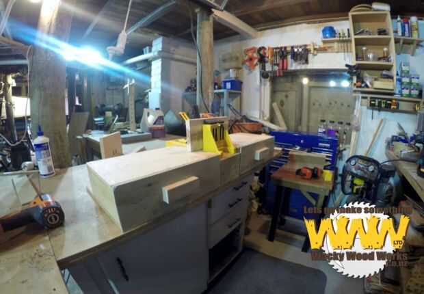 Más chatarra y la madera de alrededor de la tienda para hacer los brazos de soporte de la guía, asegurándose de que el sobre que todo la altura es la misma altura cuando la plantilla de agujero de bolsillo está sentado en su lugar.