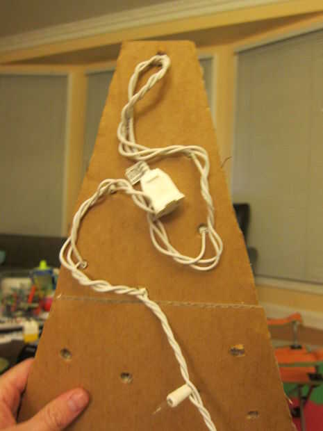 Para las luces, endecha el árbol en el suelo boca abajo, coge una cadena de luces y marque donde usted quiere que la luz ir. (Tenga cuidado de dejar una pequeña holgura entre cada luz; facilita la cadena para arriba). Use una navaja o un destornillador para perforar un agujero a través en cada marca del lápiz, luego pasar las luces. Conecte las luces y eres bueno para ir.
