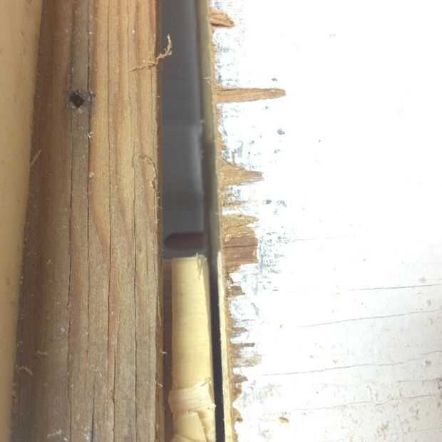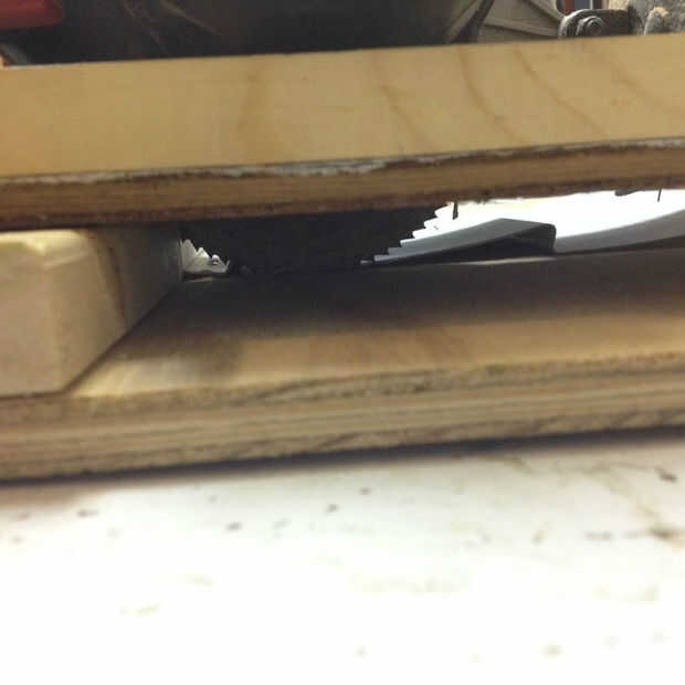 Marca el revestimiento donde debe cortar, deslice el revestimiento en la plantilla que la marca se alinea con el corte de sierra en la base de madera contrachapada, de mantener el revestimiento a la canalización vertical para asegurar un extremo cuadrado y hacer su corte. Esta configuración funcionaba increíblemente bien. Bien que realmente terminé usando un corte extremo en una articulación visible un momento o dos para minimizar el desperdicio.