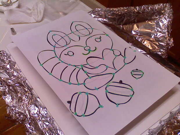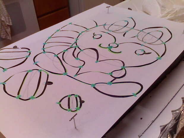Una vez que esté bien con su colocación, puede fijarlo en su lugar. Palillos de dientes pueden funcionar, pero encontramos que peluca de pins (T-pins, básicamente) funcionado incluso mejor. Son más nítidas y más pequeño, así que perfora rápidamente a través de las cuatro esquinas del papel sin arrugar o ripeo. Y sólo una media pulgada o menos de profundidad todo lo que necesita para sostenerlo.