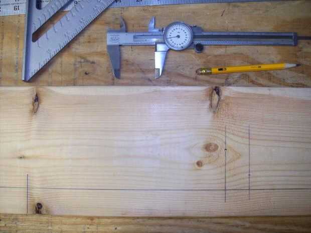 Marque el centro de la línea horizontal. 8,25 pulgadas a la derecha del centro, drenaje vertical de tres pulgadas de largo. A 9,25 pulgadas a la derecha del centro, trazar otra vertical tres pulgadas de largo. Marca la izquierda vertical en 1,64 pulgadas sobre la línea horizontal, luego marque la otra vertical en 0,60 pulgadas sobre la línea horizontal. Estas dos marcas son los centros de los dos orificios a taladrar.