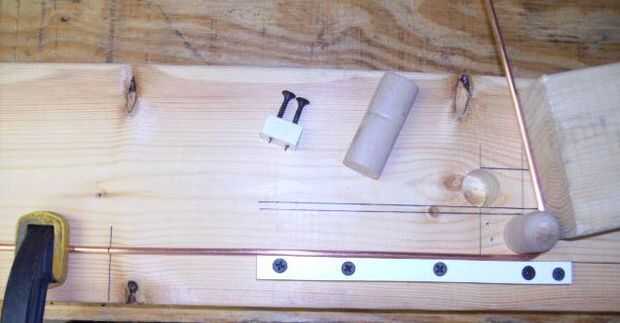 Preparar una longitud de cable de cobre desnudo #6 enderezando (véase mi Instructable alisado pesados cables de cobre sólido). Presentar un extremo cuadrado y archivo de las rebabas. Mida y marque 34,532 pulgadas de longitud de ello. Corte el alambre un poco largo, archivo a la longitud correcta y elimine las rebabas. Instalar sólo la clavija de madera inferior y retire la pequeña cala de la dobladora. Con cuidado Mida y marque el centro del alambre en pulgadas 17,266. Instale el cable en el doblador de marca en marca de la dobladora de alambre. Sujete el alambre por lo que no puede ser halado del centro por la flexión. Abrazadera de la dobladora a un banco en varios lugares. Utilice un bloque de madera para presionar el cable contra la clavija como el alambre está doblado, hasta que el cable esté alineado con las líneas horizontales de 6 pulgadas.