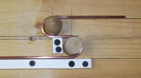 esto es como montar los elementos activos zig-zag para una antena Gray-Hoverman tv de cuarto de pulgada preparado fuera de enlaces de tubería de cobre de diámetro. Los enlaces se colocan en una plantilla de montaje y soldados juntos. Elementos de cob