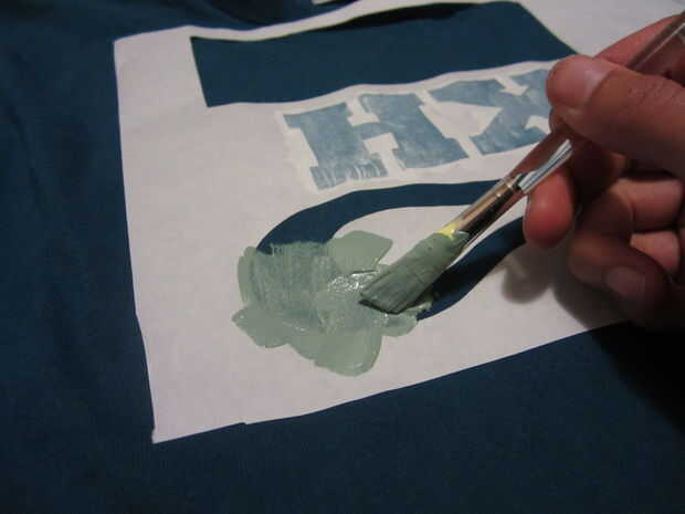 Con un pincel, la pintura directamente sobre la plantilla, asegurándose de que la pintura se extiende uniformemente. Tenga cuidado con sus golpes que accidentalmente no cepille demasiado y pintar sobre la tela exterior. Puede que necesite aplicar capas adicionales. Hice 3 o 4 en esto.