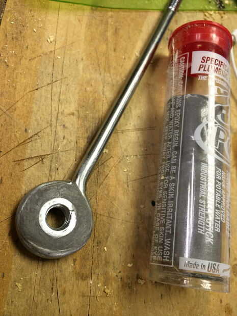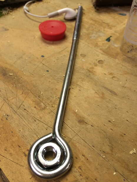 Si usted piensa que necesitará una plantilla más larga, puede virar en otra 8" mediante el uso de un perno de ojo de 1/4" x 8" de rosca en el orificio central de la plantilla de mono. Para poder utilizar los pernos de ojo 5/16", de epoxy una tuerca de 5/16" en el "ojo" de la armella. Usé PC epoxi pasta para fijar la tuerca en el ojo. Usando este arreglo que vas a tener 50" entre centros para atar las correas de hombro etc.. Por cierto, creo que es mi próxima paracord proyecto... una correa para mi plantilla de bambú.