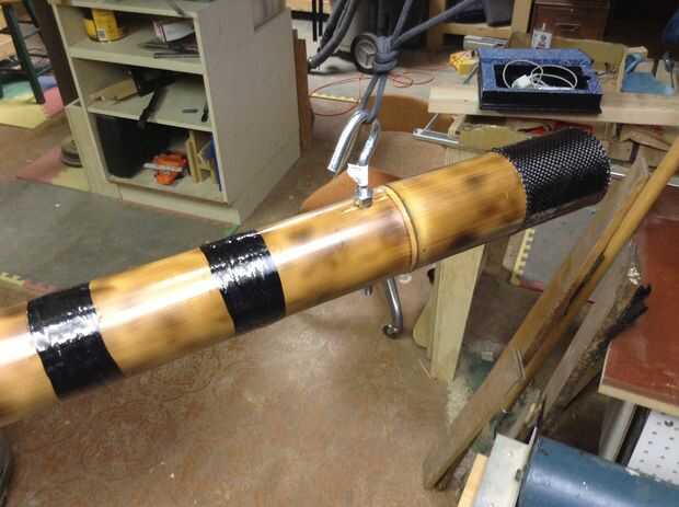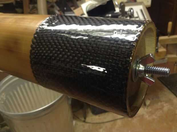 Es una buena idea para reforzar los extremos del bambú para evitar que se resquebraje y proteger del desgaste. Elegí de fibra de carbono porque tenía restos de sobras, pero puedes usar muchas cosas. Fibra de vidrio, fibra de cáñamo, cuero, cuerda o incluso paracord;) En los extremos he utilizado tejidos de fibra de carbono y las vueltas medias utilicé cinta de fibra de carbono. Aplicación de ambos es similar en que mezclar la resina epoxi según las instrucciones y luego pintar sobre el bambú con un pincel de espuma. Coloque la fibra de carbono sobre el epoxi húmedo y luego mojado hacia fuera por pintura epoxy más en la fibra. Al aplicar la fibra de la cinta también lo mojado como soy envolviéndolo alrededor. El epoxy tendrá que secar toda la noche. Usted notará en muchos de los cuadros siguientes que lija el epoxi para quitar cualquier borde filoso. Cuando terminé la plantilla, apliqué otra capa de epoxi con una brocha de espuma y déjelo secar durante la noche.