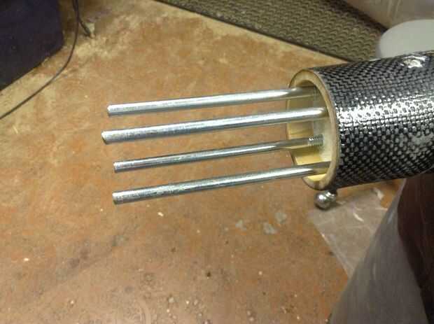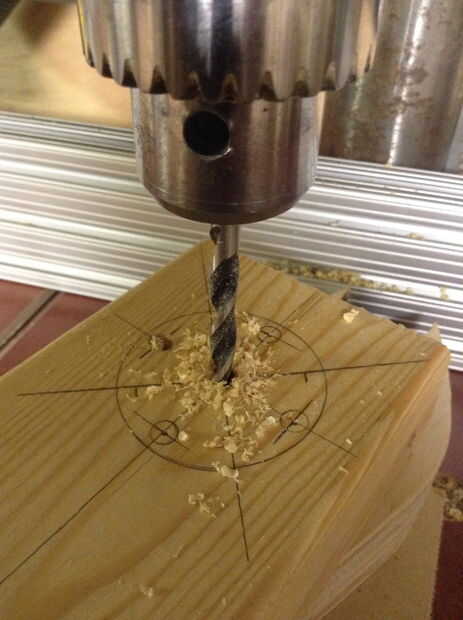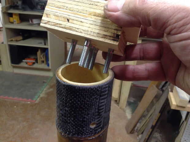 El extremo abierto de 3" del bambú parece ser un gran lugar para una plantilla de puño de mono así que vamos a hacerlo ahora. En madera dibuja un círculo del diámetro interior del bambú con 2 líneas perpendiculares, cruzándose en el centro. Dibujar cuatro círculos de 1/4" en las líneas perpendiculares aproximadamente 1/8" dentro del círculo y otro 1/4 círculo en el centro. Perfore estos 5 agujeros que actuarán como una plantilla para pernos están siendo lanzados en la resina. Idealmente se deben perforar los agujeros en una prensa del taladro para mantener los pernos tan paralelo como sea posible. Capa el largo 5/16" perno que atraviesa el bambú como antes e inserte a través de los orificios en la parte inferior de la"cup". Otra vez la resina de la mezcla como se indica y verter en la taza. Cubra todos los 5 de los pernos de 1/4" con vaselina y establecidas en la resina dentro de la taza.