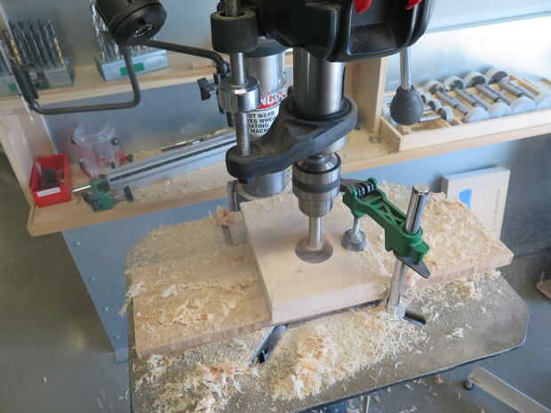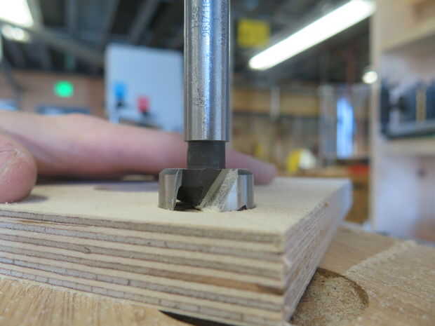 Cambiar a 1'' forstner broca y taladro 3/8 de pulgada profundos bolsillos cada uno de los agujeros de 5/16. Broca que empareja los bolsillos en la parte inferior de la pieza rectangular también. Estos bolsillos va a ser donde van las arandelas y las tuercas en T y también se creará un espacio para la cabeza del perno para descansar para que la plantilla se encuentra en la cama de la prensa de taladro más adelante.
