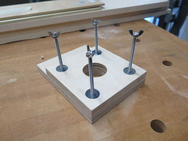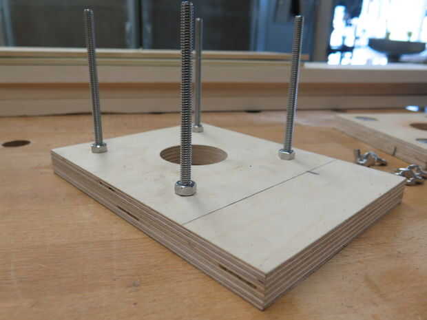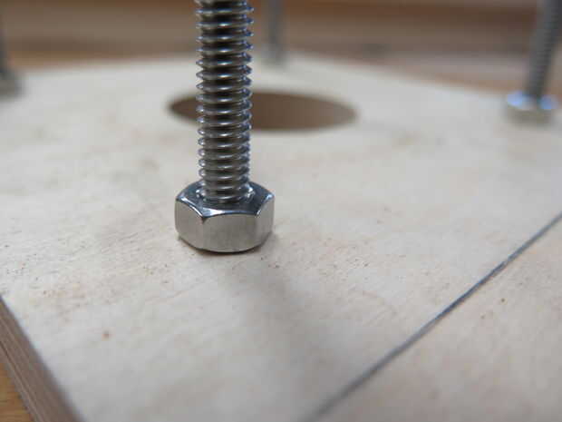 A continuación, pulsa en las arandelas en los orificios de la más pequeña pieza cuadrada de madera contrachapada y colóquela sobre los pernos. Enrosque las tuercas de mariposa en los pernos de la parte superior y su plantilla está bastante acabado.