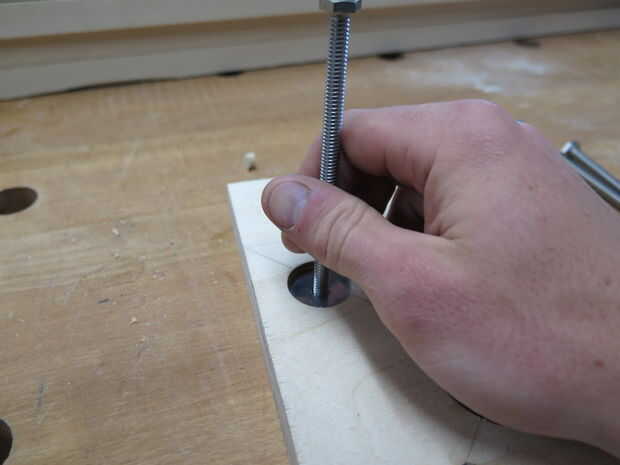 Si usted está usando las tuercas en T inserta en el bolsillo en la parte inferior de la pieza rectangular más grande de la madera contrachapada. e hilo de rosca en los pernos. Si usted está usando sólo arandelas de insertarlos en el agujero e hilo de rosca de una tuerca hexagonal en el otro lado para mantener los pernos en su lugar.