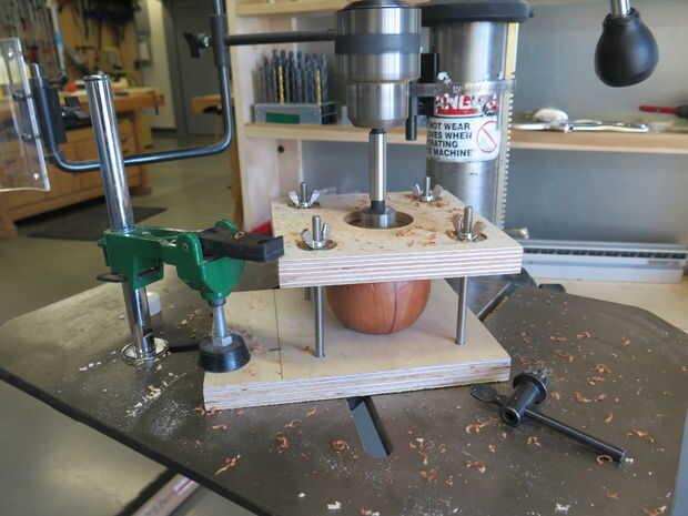 Una vez que la esfera quede firmemente asegurada en lugar puede alinear una broca en el centro de su esfera y lejos del taladro. Usé esta plantilla para un proyecto que se presenta en Instructables pronto.