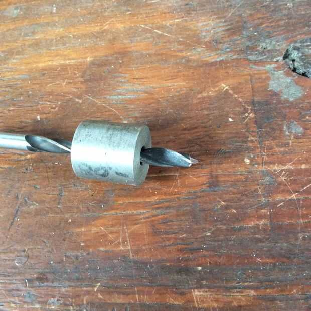 Necesitaba perforar agujeros que eran 1/4" de diámetro, pero yo quería ser capaz de perforar otros tamaños también. Tenía una pieza de 1" barra redonda con un agujero de 1/4" que he utilizado como una guía de taladro. Si tienes un torno de metal, rápidamente puede hacer su propia guía de taladro, o usted puede comprar cualquier tamaño que usted necesita de McMaster Carr. Es vendidos bajo el nombre de "taladro bujes" y están hechos de acero templado para que no se desgastan con el uso pesado.