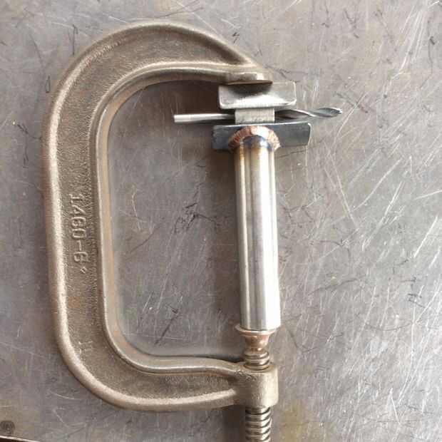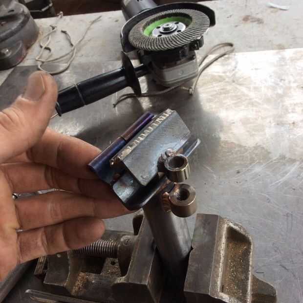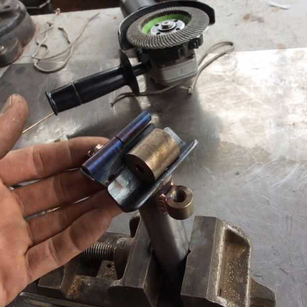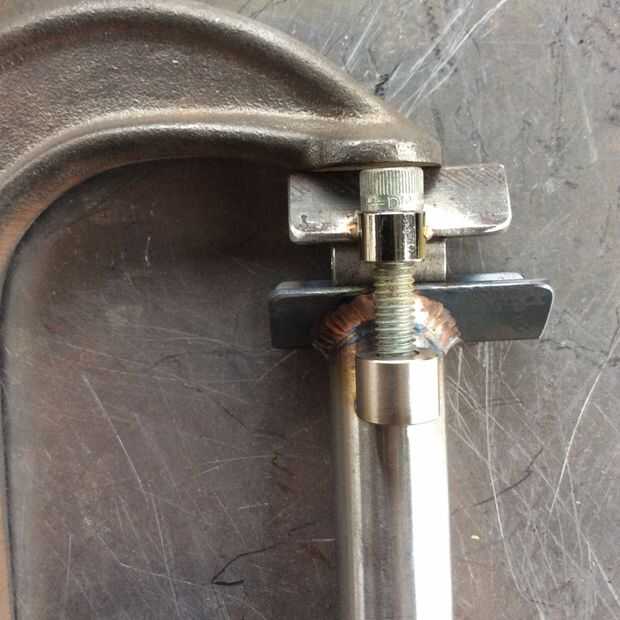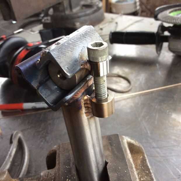 El siguiente paso es añadir el tornillo de sujeción. Utilicé un trozo de barra redonda que ya fue perforado y golpeado ligeramente, pero también se puede usar una tuerca. Un pequeño trozo de tubo también fue soldada con autógena a la mitad superior de la abrazadera. Utilice el tornillo de fijación para alinear todo.