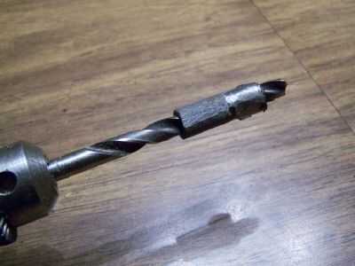que necesitaba una funda de metal para guiar la broca. Lo que se conoce en los E.e.u.u. como 1/4 de pulgada niple funcionó muy bien. Internamente es un poco más grande que 1/4 de pulgada de diámetro. Perforé hacia fuera 19/64 de pulgada, que es el tamaño del agujero que estoy usando para los tacos en el rompecabezas de madera.
