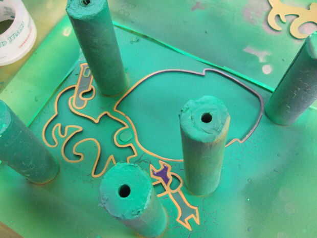 La segunda capa sólo cubre el contorno verde dejando el interior a pintar morado. Después de usarlo un par de veces puede que necesite para raspar la pintura de los bordes para perfectamente encaja en la primera plantilla.