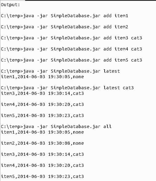 C:\temp > java-jar SimpleDatabase.jar última cat3 item3, 2014-06-03 19:30:14, cat3
