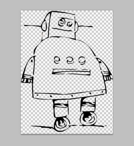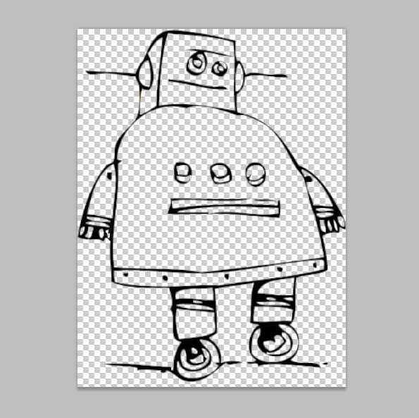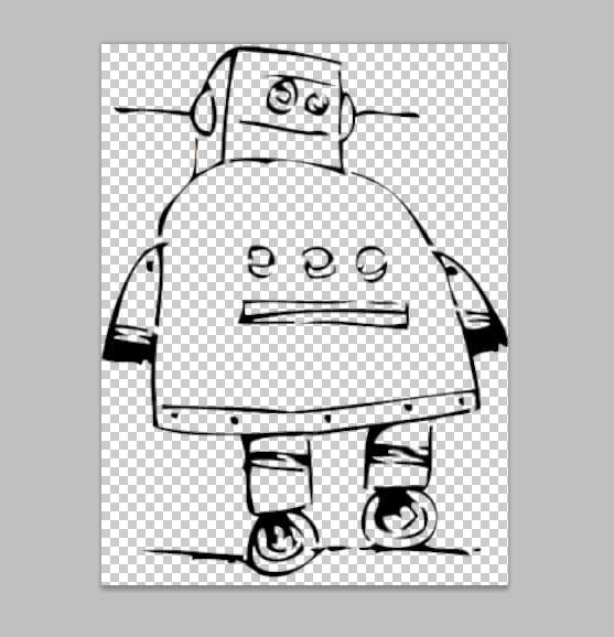 Primero importados la imagen del robot en Photoshop. Con la herramienta varita mágica, selecciona áreas de color y había eliminado de la capa. Las restantes áreas negras son las piezas que se cortan hacia fuera (Fig. 2). Me aseguré de conectar todas las islas de material con fichas pequeñas para que no consigue cortar lejos, hice esto usando la herramienta Borrador (fig 3). Decidí que los dedos del robot fueron demasiado pequeños para agregar fichas, por lo que sólo llena estas áreas de negro por ahora (Fig. 4). Te agrego color a estos espacios en un paso posterior.
