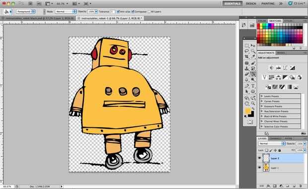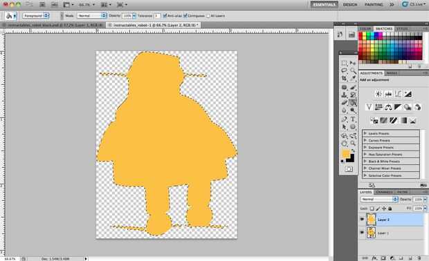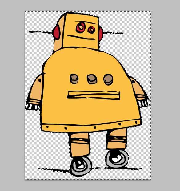 seleccioné el fondo de la imagen con la herramienta varita mágica (fig 1). Ctrl + comando + i para seleccionar el inverso. Seleccioné el color amarillo de la robusteza usando la herramienta Cuentagotas. Creé una nueva capa y llena el área seleccionada de amarillo (figs. 2 y 3). Entonces borré la imagen original (capa de fondo). Usé la herramienta Borrar para quitar partes no deseadas de la capa amarilla restantes. Opté por quitar las ruedas y la antena de la capa amarilla ya que no habrá ningún amarillo en estas partes en la imagen final (Fig. 4).