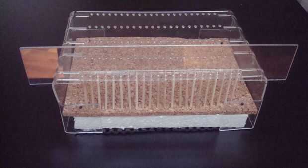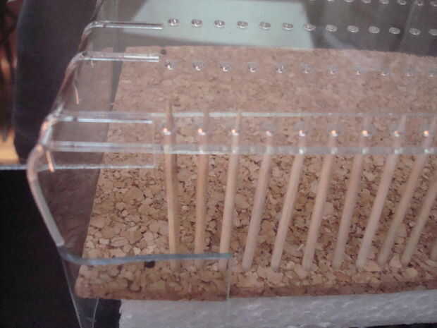Inserte las piquetas del diente a través de los orificios en la parte superior de la plantilla y empujar a través de la capa de corcho y poliestireno tan sólo la punta del palillo de lo dientes está por encima de la superficie de la plantilla.  Tengo una capa de corcho ya que mantiene un muy buen agarre en los palillos y se cerciora que no agitan cuando suelde.