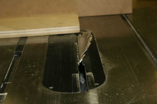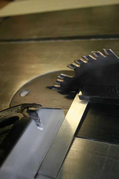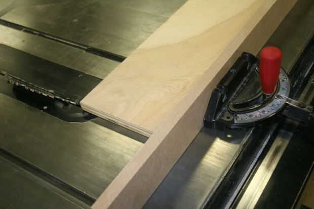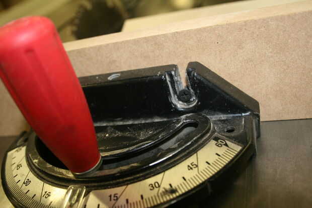 En el interior dos piezas se tienen que cortar 45 en los fondos. Las dos piezas interiores son 7 1/4 x 13 1/2 y 7 1/4 x 9 1/2. No tienes que cortar 45 en la parte superior, hacer. Usando la tabla vio, configurar el inglete deslizante con un pedazo de madera contrachapada o MDF Ripeado hasta 3 pulgadas de alto fije. Asegúrese de que el inglete deslizante es cuadrado a la hoja. Con dos tornillos y pistola inalámbrica Sujete la madera a la guía de inglete. Mover la cuchilla a un ángulo de 45 grados y corte los lados interior piezas.